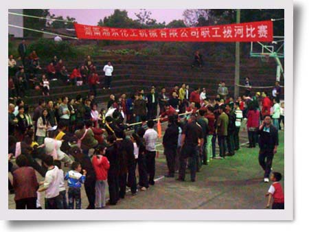 當(dāng)天晚上7點(diǎn),觀眾來(lái)到湘東化機(jī)生活區(qū)的燈光藍(lán)球場(chǎng)時(shí),只見(jiàn)黑壓壓一片人群將賽場(chǎng)圍得水泄不通,哇,好熱鬧,“加油、加油、加油。。。。。。”,拉拉隊(duì)的助威聲震天響,整個(gè)比賽氣氛一再被推向高潮。8個(gè)隊(duì)120名職工在比賽場(chǎng)上進(jìn)行激烈的角逐,隊(duì)員們的心就像那根拔河繩凝聚成一根繩,在領(lǐng)隊(duì)的精心組織下,在拉拉隊(duì)的助陣下,勁往一處使。經(jīng)過(guò)2個(gè)小時(shí)的初賽和決賽,汽輪機(jī)分會(huì)和機(jī)關(guān)分會(huì)分別奪取了冠、亞軍。